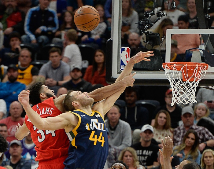 (Francisco Kjolseth | The Salt Lake Tribune) Utah Jazz forward Bojan Bogdanovic (44) shrugs a call as the Utah Jazz host the New Orleans Pelicans in their NBA basketball game at Vivint Smart Home Arena in Salt Lake City on Sat. Nov. 23, 2019.