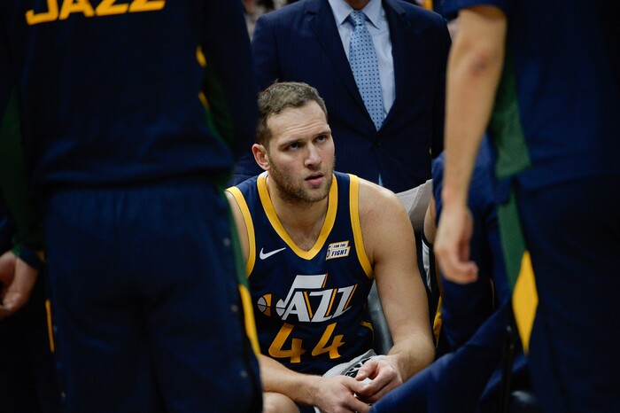 (Francisco Kjolseth | The Salt Lake Tribune) Utah Jazz forward Bojan Bogdanovic (44) is introduced as the Utah Jazz host the New Orleans Pelicans in their NBA basketball game at Vivint Smart Home Arena in Salt Lake City on Sat. Nov. 23, 2019.