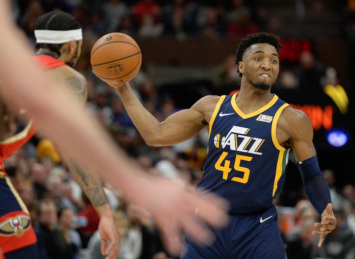 (Francisco Kjolseth | The Salt Lake Tribune) Utah Jazz guard Donovan Mitchell (45) passes the ball to a teammate as the Utah Jazz host the New Orleans Pelicans in their NBA basketball game at Vivint Smart Home Arena in Salt Lake City on Sat. Nov. 23, 2019.