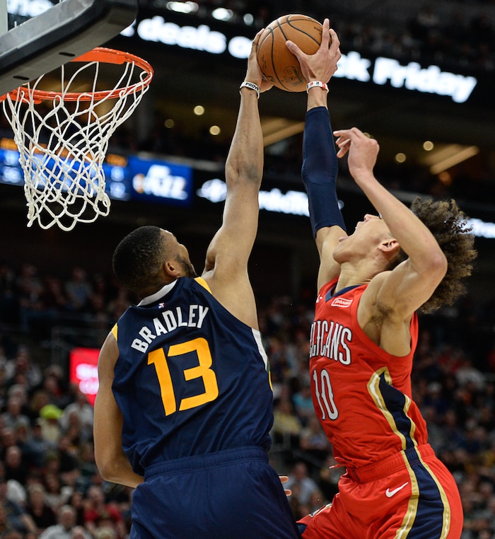 (Francisco Kjolseth | The Salt Lake Tribune) Utah Jazz center Tony Bradley (13) moves in for the monster block on New Orleans Pelicans center Jaxson Hayes (10) as the Utah Jazz host the New Orleans Pelicans in their NBA basketball game at Vivint Smart Home Arena in Salt Lake City on Sat. Nov. 23, 2019.