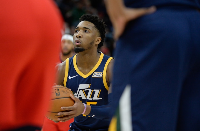 (Francisco Kjolseth | The Salt Lake Tribune) Utah Jazz guard Donovan Mitchell (45) concentrates on the basket as the Utah Jazz host the New Orleans Pelicans in their NBA basketball game at Vivint Smart Home Arena in Salt Lake City on Sat. Nov. 23, 2019.