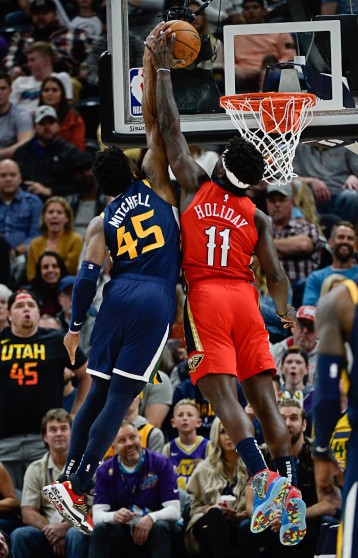 (Francisco Kjolseth | The Salt Lake Tribune) Utah Jazz guard Donovan Mitchell (45) is blocked by New Orleans Pelicans guard Jrue Holiday (11) as the Utah Jazz host the New Orleans Pelicans in their NBA basketball game at Vivint Smart Home Arena in Salt Lake City on Sat. Nov. 23, 2019.