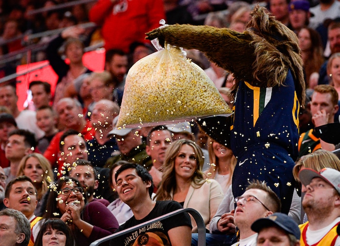(Francisco Kjolseth | The Salt Lake Tribune) Bear dishes out the popcorn in peoples hats as the Utah Jazz host the New Orleans Pelicans in their NBA basketball game at Vivint Smart Home Arena in Salt Lake City on Sat. Nov. 23, 2019.