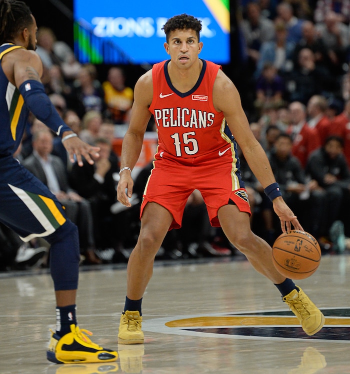 (Francisco Kjolseth | The Salt Lake Tribune) Former Lone Peak High School player New Orleans Pelicans guard Frank Jackson (15) sizes up the opposition as the Utah Jazz host the New Orleans Pelicans in their NBA basketball game at Vivint Smart Home Arena in Salt Lake City on Sat. Nov. 23, 2019.