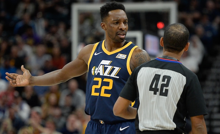(Francisco Kjolseth | The Salt Lake Tribune) Utah Jazz forward Jeff Green (22) argues with referee Brian Forte (45) as the Utah Jazz host the New Orleans Pelicans in their NBA basketball game at Vivint Smart Home Arena in Salt Lake City on Sat. Nov. 23, 2019.