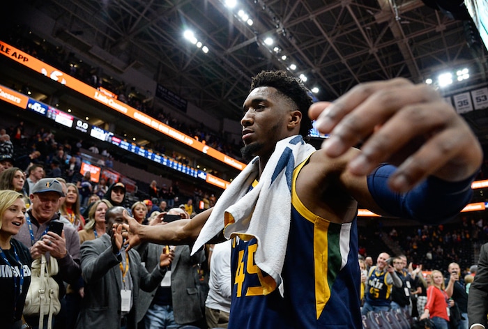 (Francisco Kjolseth | The Salt Lake Tribune) Utah Jazz guard Donovan Mitchell (45) celebrates with fans the team win 128-120 as the Utah Jazz host the New Orleans Pelicans in their NBA basketball game at Vivint Smart Home Arena in Salt Lake City on Sat. Nov. 23, 2019.