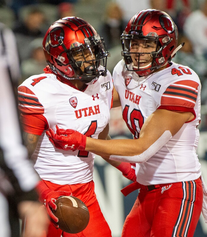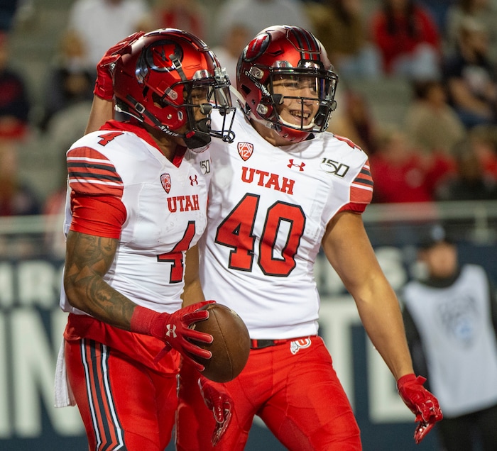 (Rick Egan | The Salt Lake Tribune) Utah Utes tight end Ali'i Niumatalolo (40) congratulates Utah Utes running back TJ Green (4) after he scored a touchdown, in PAC-12 action between the Utah Utes and the Arizona Wildcats in Tucson, Saturday, Nov. 23, 2019.