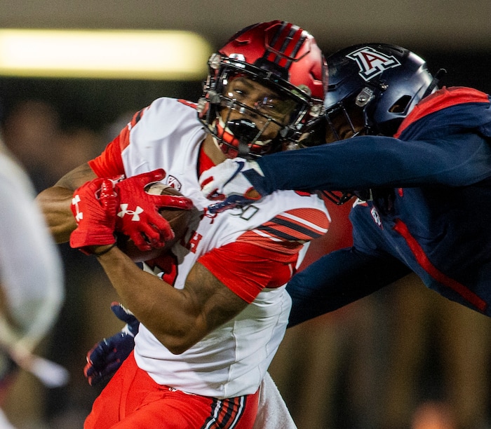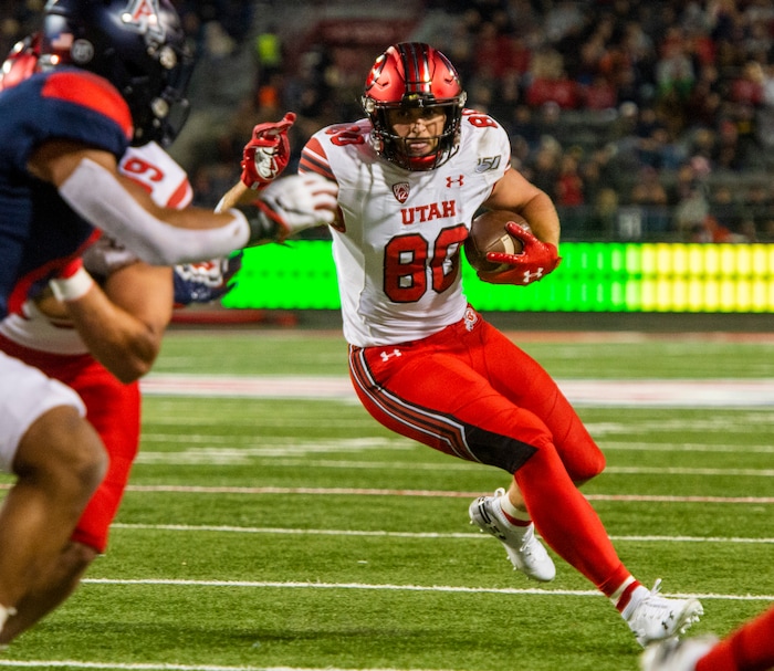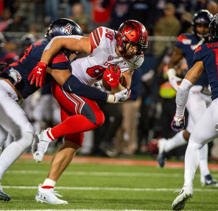 (Rick Egan | The Salt Lake Tribune) Utah Utes tight end Brant Kuithe (80) is stopped short of the end zone by the Arizona Wildcats defender, in PAC-12 action between the Utah Utes and the Arizona Wildcats in Tucson, Saturday, Nov. 23, 2019.