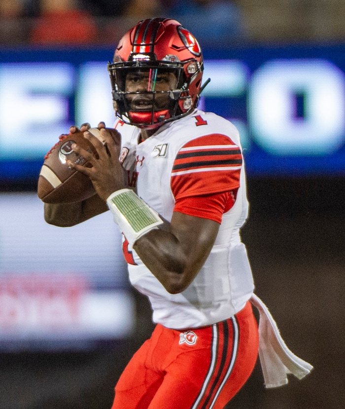 (Rick Egan | The Salt Lake Tribune) Utah Utes quarterback Tyler Huntley (1) looks down field, in PAC-12 action between the Utah Utes and the Arizona Wildcats in Tucson, Saturday, Nov. 23, 2019.