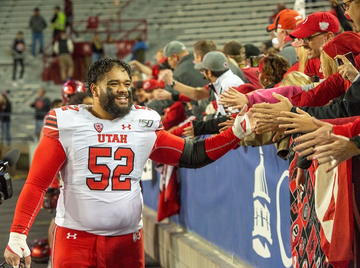 (Rick Egan | The Salt Lake Tribune) Utah Utes defensive tackle John Penisini (52) greets the fans after the Utes defeated the Wildcats, 35-7, in PAC-12 action between the Utah Utes and the Arizona Wildcats in Tucson, Saturday, Nov. 23, 2019.