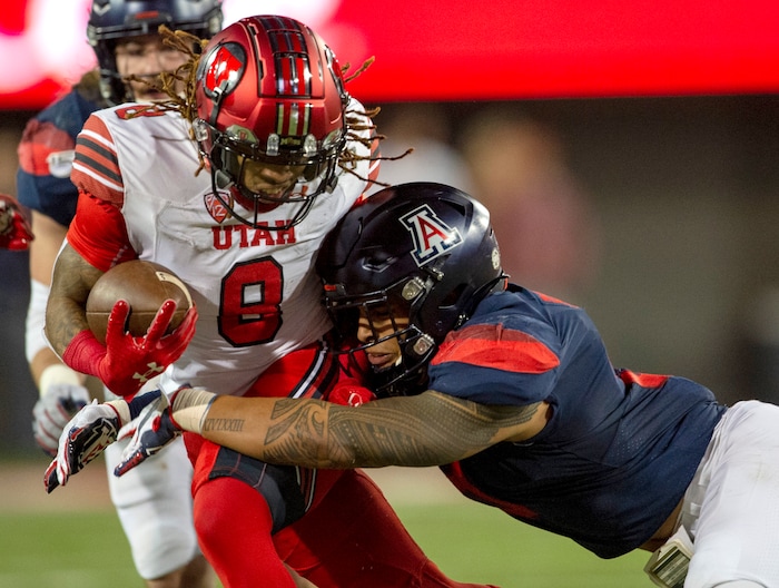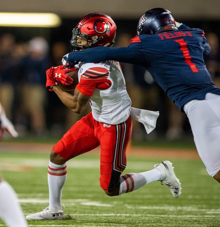 (Rick Egan | The Salt Lake Tribune) Utah wide receiver Derrick Vickers (8) runs the ball past Arizona Wildcats linebacker Tony Fields II (1), in PAC-12 action between the Utah Utes and the Arizona Wildcats in Tucson, Saturday, Nov. 23, 2019.