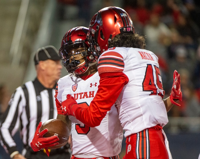 (Rick Egan | The Salt Lake Tribune) Utah Utes wide receiver Samson Nacua (45) contraculates Utah Utes wide receiver Demari Simpkins (3) after he scored a touchdown, in PAC-12 action between the Utah Utes and the Arizona Wildcats in Tucson, Saturday, Nov. 23, 2019.