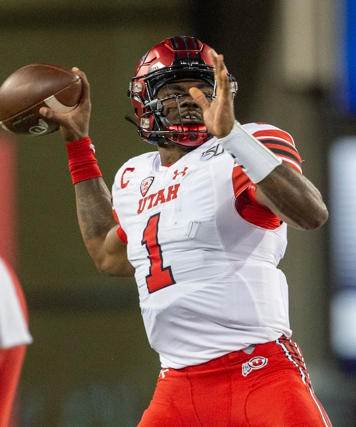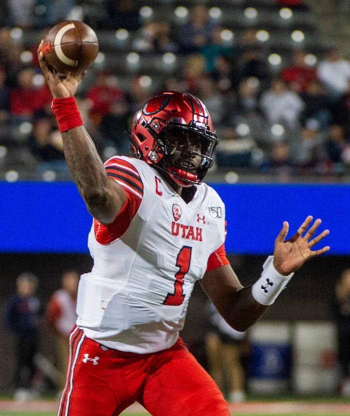 (Rick Egan | The Salt Lake Tribune) Utah Utes quarterback Tyler Huntley (1) throws the ball, in PAC-12 action between the Utah Utes and the Arizona Wildcats in Tucson, Saturday, Nov. 23, 2019.