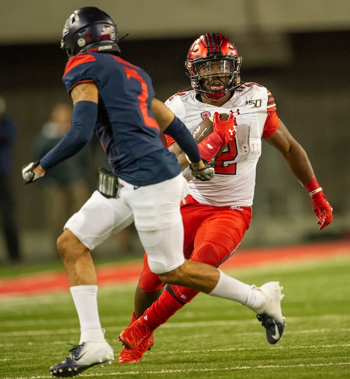 (Rick Egan | The Salt Lake Tribune) Utah Utes running back Zack Moss (2) runs the ball as Arizona Wildcats cornerback Lorenzo Burns (2) defends, in PAC-12 action between the Utah Utes and the Arizona Wildcats in Tucson, Saturday, Nov. 23, 2019.
