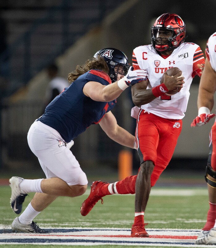 (Rick Egan | The Salt Lake Tribune) Arizona Wildcats linebacker Colin Schooler (7) grabs Utah Utes quarterback Tyler Huntley (1) as he scrambles with the ball, in PAC-12 action between the Utah Utes and the Arizona Wildcats in Tucson, Saturday, Nov. 23, 2019.
