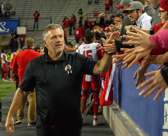 (Rick Egan | The Salt Lake Tribune) Utah Utes head coach Kyle Whittingham greets the fans after defeating the Wildcats, 35-7, in PAC-12 action between the Utah Utes and the Arizona Wildcats in Tucson, Saturday, Nov. 23, 2019.