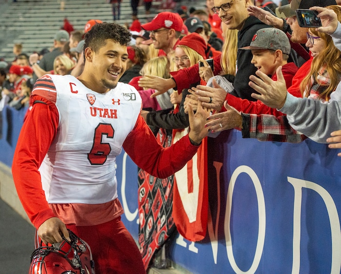 (Rick Egan | The Salt Lake Tribune) Utah Utes defensive end Bradlee Anae (6) greets the fans after the Utes defeated the Wildcats, 35-7, in PAC-12 action between the Utah Utes and the Arizona Wildcats in Tucson, Saturday, Nov. 23, 2019.