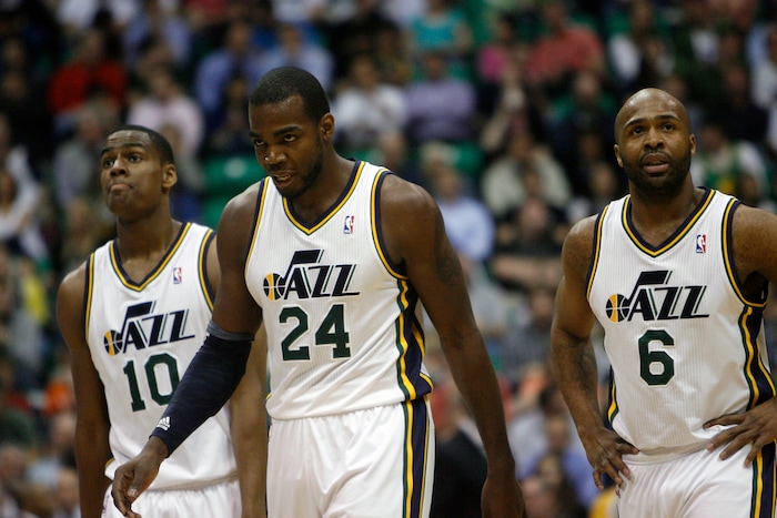 Chris Detrick | The Salt Lake Tribune Utah Jazz point guard Alec Burks (10) Utah Jazz power forward Paul Millsap (24) and Utah Jazz point guard Jamaal Tinsley (6) walk off of the court during the first half of the game at EnergySolutions Arena Friday April 12, 2013. Minnesota Timberwolves are winning the game 54-53 at halftime.