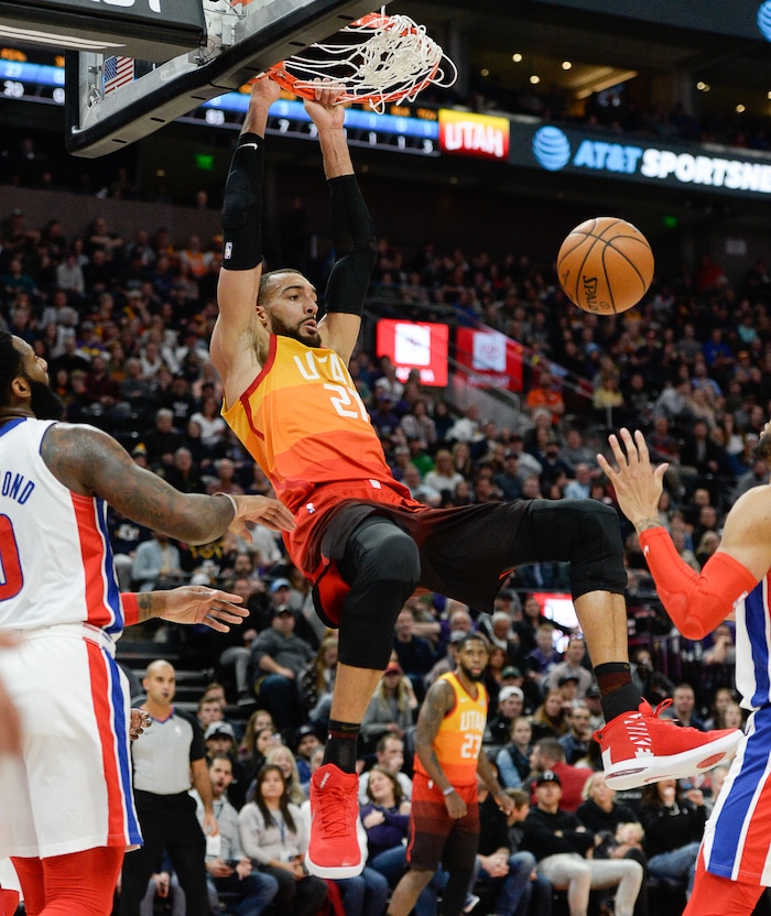 (Francisco Kjolseth | The Salt Lake Tribune) Utah Jazz center Rudy Gobert (27) sinks the basket as the Utah Jazz host the Detroit Pistons in their NBA basketball game at Vivint Smart Home Arena in Salt Lake City on Monday, Dec. 30, 2019.
