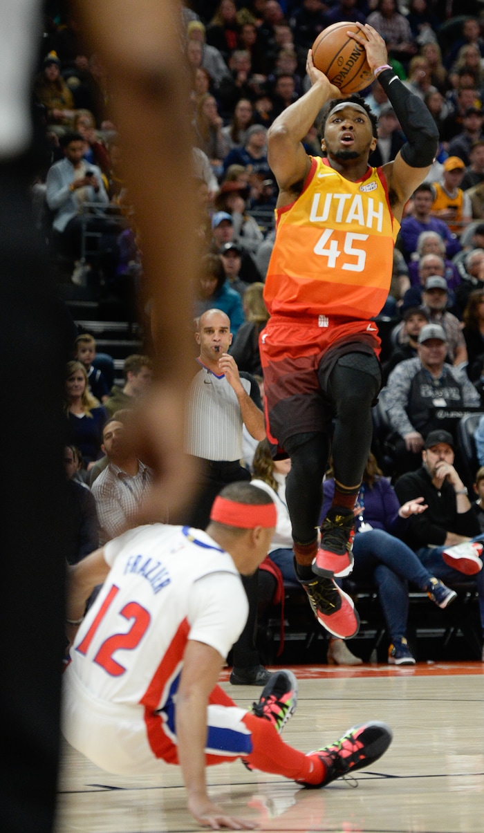 (Francisco Kjolseth | The Salt Lake Tribune) Utah Jazz guard Donovan Mitchell (45) takes a fade away shot as the Utah Jazz host the Detroit Pistons in their NBA basketball game at Vivint Smart Home Arena in Salt Lake City on Monday, Dec. 30, 2019.