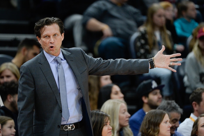 (Francisco Kjolseth | The Salt Lake Tribune) Utah Jazz coach Quin Snyder speaks with his players as the Utah Jazz host the Detroit Pistons in their NBA basketball game at Vivint Smart Home Arena in Salt Lake City on Monday, Dec. 30, 2019.
