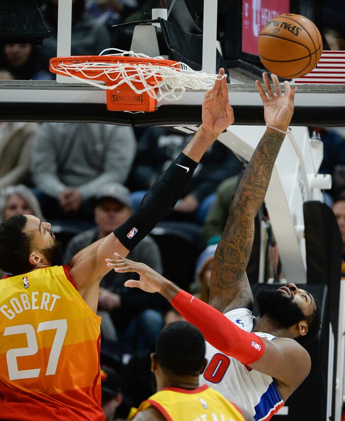 (Francisco Kjolseth | The Salt Lake Tribune) Utah Jazz center Rudy Gobert (27) puts pressure on Detroit Pistons center Andre Drummond (0) as the Utah Jazz host the Detroit Pistons in their NBA basketball game at Vivint Smart Home Arena in Salt Lake City on Monday, Dec. 30, 2019.