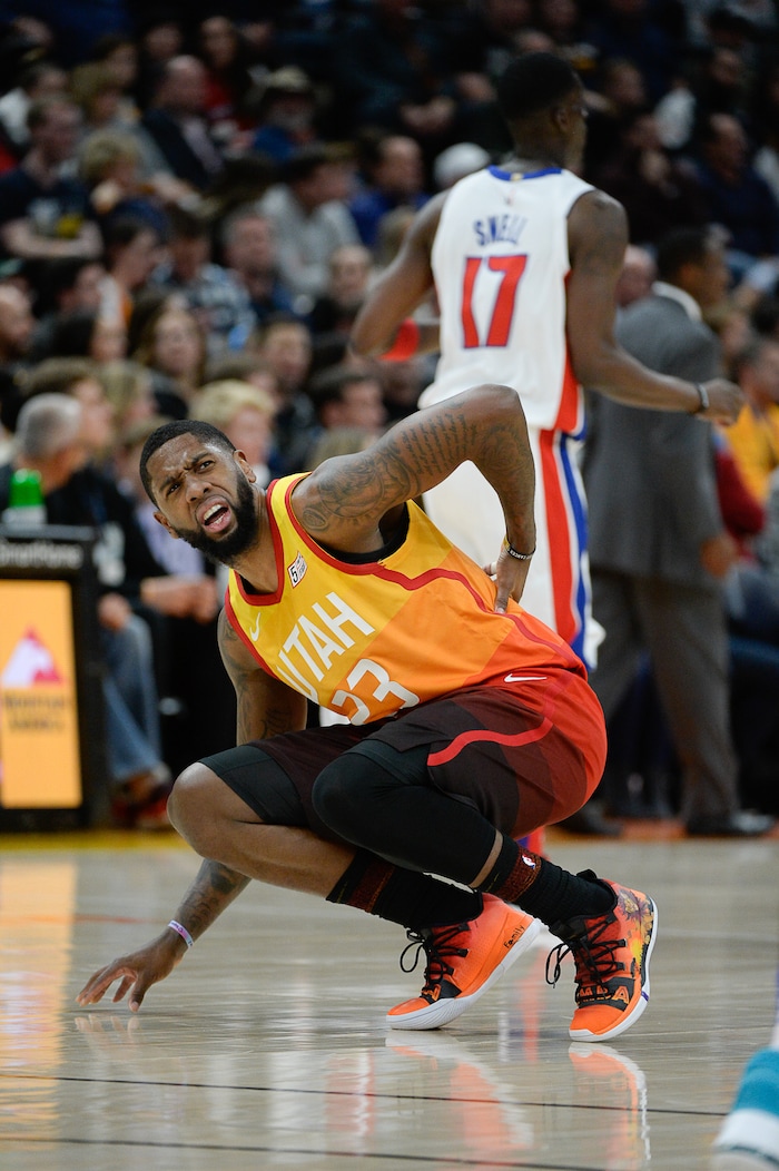 (Francisco Kjolseth | The Salt Lake Tribune) Utah Jazz forward Royce O'Neale (23) appears to hurt his back as the Utah Jazz host the Detroit Pistons in their NBA basketball game at Vivint Smart Home Arena in Salt Lake City on Monday, Dec. 30, 2019.