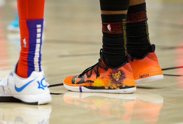 (Francisco Kjolseth | The Salt Lake Tribune) Utah Jazz forward Royce O'Neale (23) sports Lion King shoes as the Utah Jazz host the Detroit Pistons in their NBA basketball game at Vivint Smart Home Arena in Salt Lake City on Monday, Dec. 30, 2019.