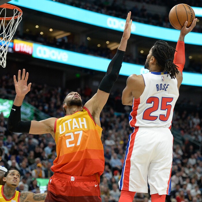 (Francisco Kjolseth | The Salt Lake Tribune) Utah Jazz center Rudy Gobert (27) pressures Detroit Pistons guard Derrick Rose (25) as the Utah Jazz host the Detroit Pistons in their NBA basketball game at Vivint Smart Home Arena in Salt Lake City on Monday, Dec. 30, 2019.