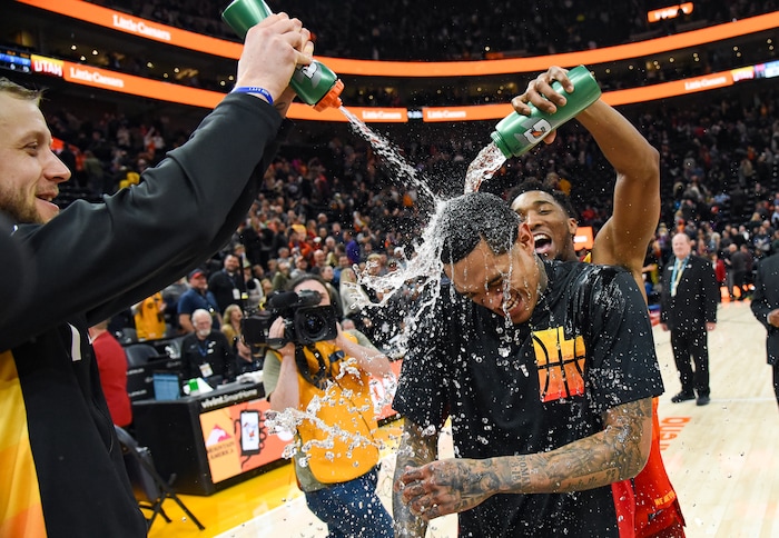 (Francisco Kjolseth | The Salt Lake Tribune) Utah Jazz guard Jordan Clarkson (00) gets the celebratory water dousing by Utah Jazz forward Joe Ingles (2) and Utah Jazz guard Donovan Mitchell (45) as the Jazz beat the Detroit Pistons 104-81 in their NBA basketball game at Vivint Smart Home Arena in Salt Lake City on Monday, Dec. 30, 2019.
