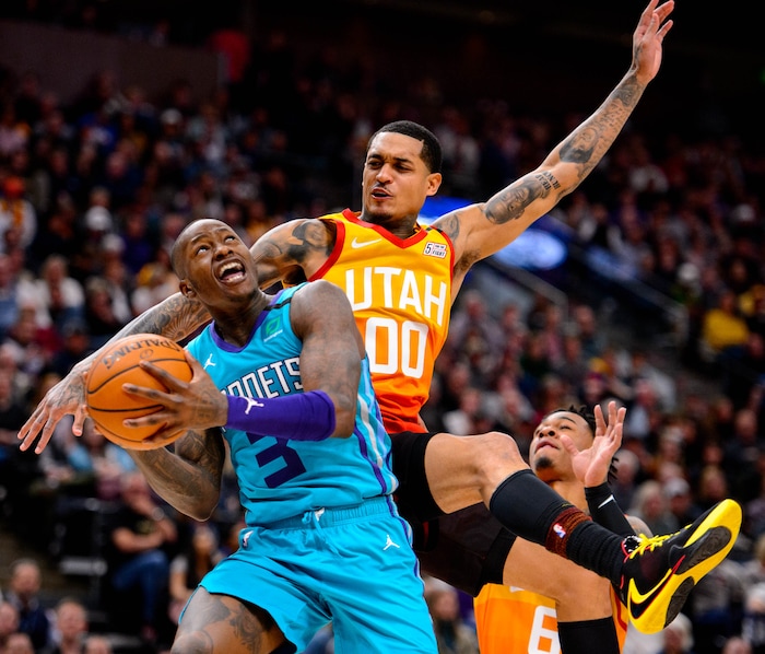 (Trent Nelson | The Salt Lake Tribune) Utah Jazz guard Jordan Clarkson (00) defending Charlotte Hornets guard Terry Rozier (3) as the Utah Jazz host the Charlotte Hornets, NBA basketball in Salt Lake City on Friday, Jan. 10, 2020.