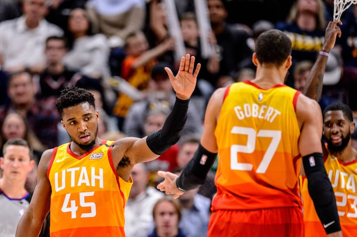 (Trent Nelson | The Salt Lake Tribune) Utah Jazz guard Donovan Mitchell (45) high-fives Utah Jazz center Rudy Gobert (27) as the Utah Jazz host the Charlotte Hornets, NBA basketball in Salt Lake City on Friday, Jan. 10, 2020.