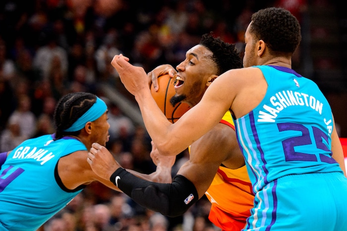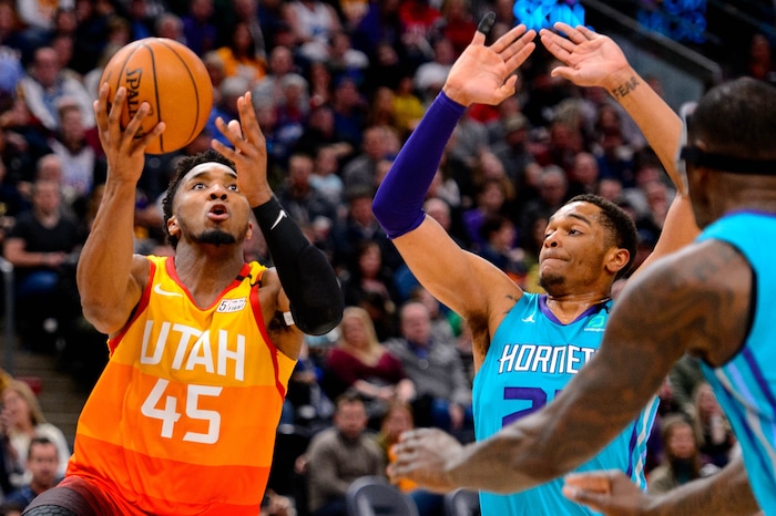 (Trent Nelson | The Salt Lake Tribune) Utah Jazz guard Donovan Mitchell (45) drives between Charlotte Hornets guard Devonte' Graham (4) and Charlotte Hornets forward PJ Washington (25) as the Utah Jazz host the Charlotte Hornets, NBA basketball in Salt Lake City on Friday, Jan. 10, 2020.