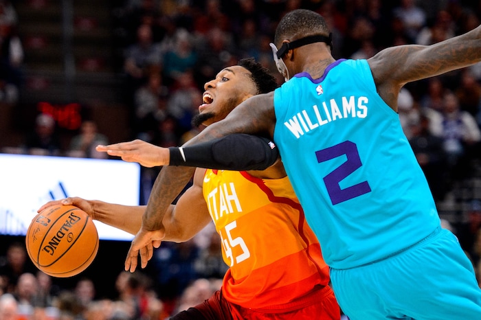 (Trent Nelson | The Salt Lake Tribune) Utah Jazz guard Donovan Mitchell (45) tangles with Charlotte Hornets forward Marvin Williams (2) as the Utah Jazz host the Charlotte Hornets, NBA basketball in Salt Lake City on Friday, Jan. 10, 2020.