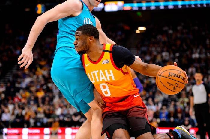 (Trent Nelson | The Salt Lake Tribune) Utah Jazz guard Emmanuel Mudiay (8) as the Utah Jazz host the Charlotte Hornets, NBA basketball in Salt Lake City on Friday, Jan. 10, 2020.