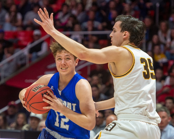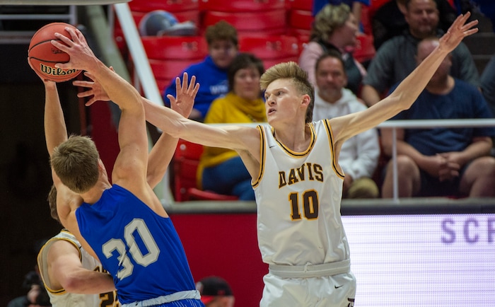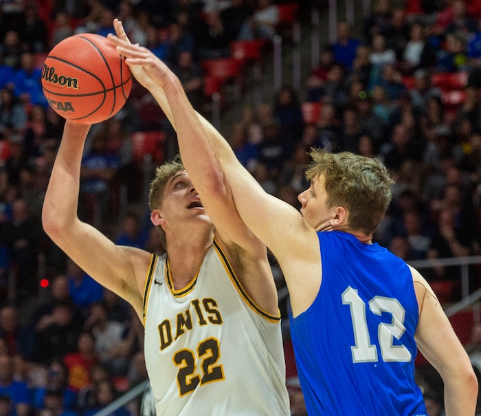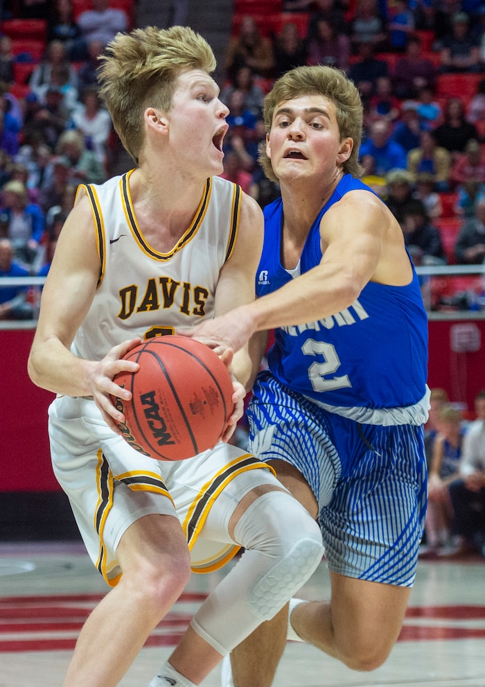 (Rick Egan | The Salt Lake Tribune) Davis High forward Jax Pearce (22) drives under the basket as Silverwolves Mitch Stratford (12) defends, in the 6A championship game at the Jon M. Huntsman Center, Saturday Feb. 29, 2020