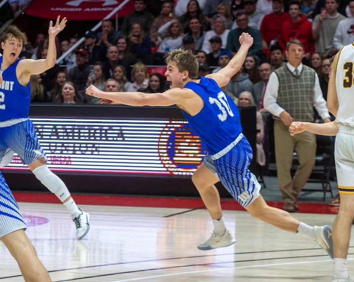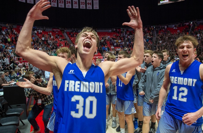 (Rick Egan | The Salt Lake Tribune) Fremont Silverwolves Dallin Hall (30),Celebrates the Fremonts win over the Davis Darts, in the 6A championship game at the Jon M. Huntsman Center, Saturday Feb. 29, 2020