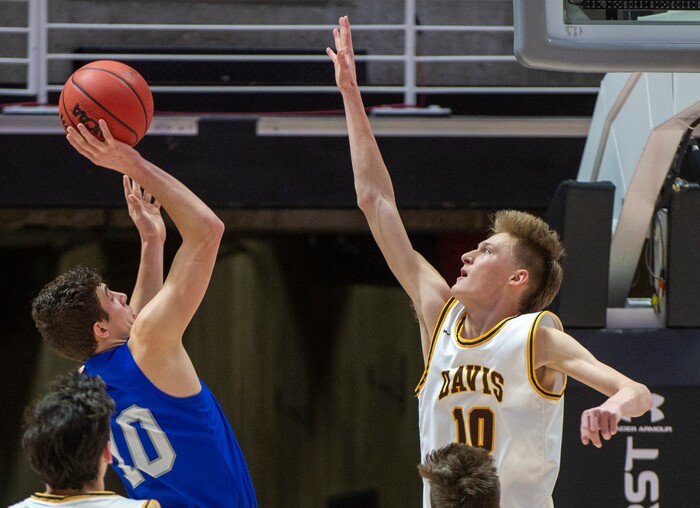 (Rick Egan | The Salt Lake Tribune) Davis High forward Jax Pearce (22) shoots as Fremont Silverwolves Mitch Stratford (12) defends, in the 6A championship game at the Jon M. Huntsman Center, Saturday Feb. 29, 2020