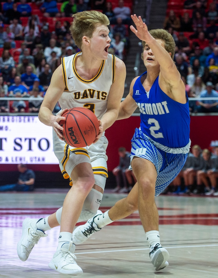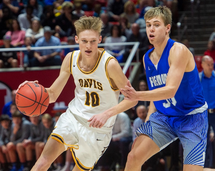 (Rick Egan | The Salt Lake Tribune) Davis High forward Spencer Vernon (2) drives drives down court, in the 6A championship game at the Jon M. Huntsman Center, Saturday Feb. 29, 2020