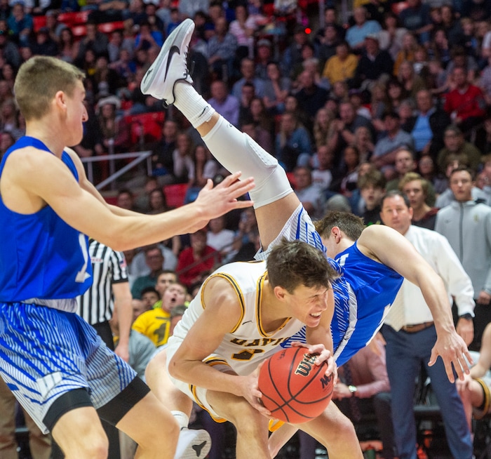 (Rick Egan | The Salt Lake Tribune) Fremont Silverwolves Mitch Stratford (12) lands onto of Davis High forward Spencer Vernon (2), in the 6A championship game at the Jon M. Huntsman Center, Saturday Feb. 29, 2020