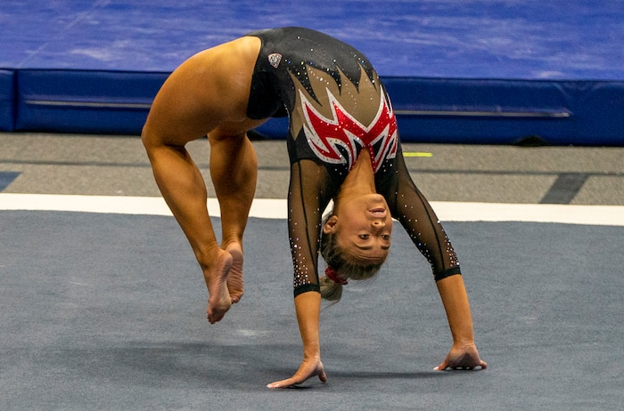 (Rick Egan | The Salt Lake Tribune) Maile O'Keefe competes on the floor, in PAC-12 gymnastics action between The University of Washington and The University of Utah at Jon M. Huntsman Center in Salt Lake City, on Saturday, Jan. 30, 2021.
