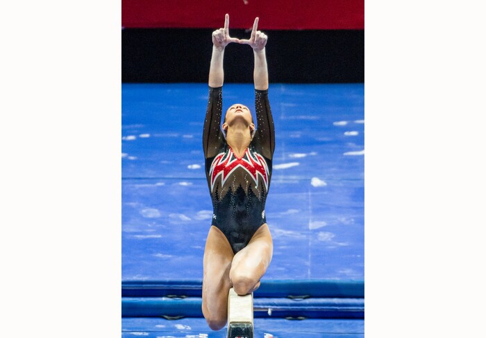 (Rick Egan | The Salt Lake Tribune) Maile O'Keefe scores a 10 on the Beam, in PAC-12 gymnastics action between The University of Washington and The University of Utah at Jon M. Huntsman Center in Salt Lake City, on Saturday, Jan. 30, 2021.
