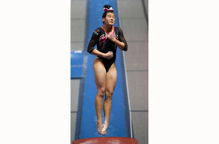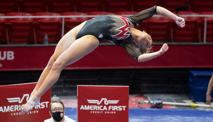 (Rick Egan | The Salt Lake Tribune) Alexia Burch competes on the vault, in PAC-12 gymnastics action between The University of Washington and The University of Utah at Jon M. Huntsman Center in Salt Lake City, on Saturday, Jan. 30, 2021.