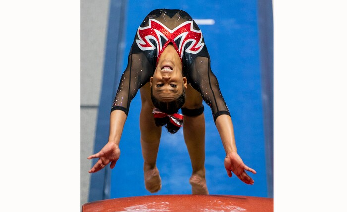 (Rick Egan | The Salt Lake Tribune) Cammy Hall competes on the vault, in PAC-12 gymnastics action between The University of Washington and The University of Utah at Jon M. Huntsman Center in Salt Lake City, on Saturday, Jan. 30, 2021.
