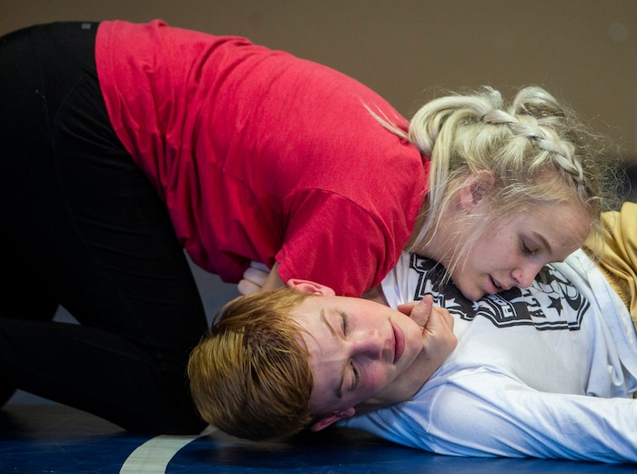 “If you meet her with aggression, she comes back 10 times stronger,” said Brooklyn Pace, a 120-pound female wrestler for Copper Hills High.