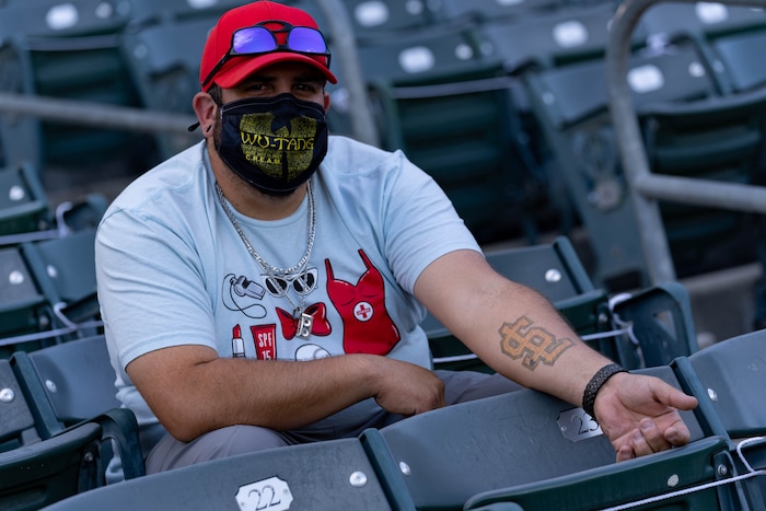 (Francisco Kjolseth | The Salt Lake Tribune) Salt Lake Bees fan Anthony Lujan shows off his team tattoo as he remarks “I go all the way back to the Trapper’s days,” as he attends the season opener Thursday night, May 6, 2021, after shutting down last season due to the pandemic.