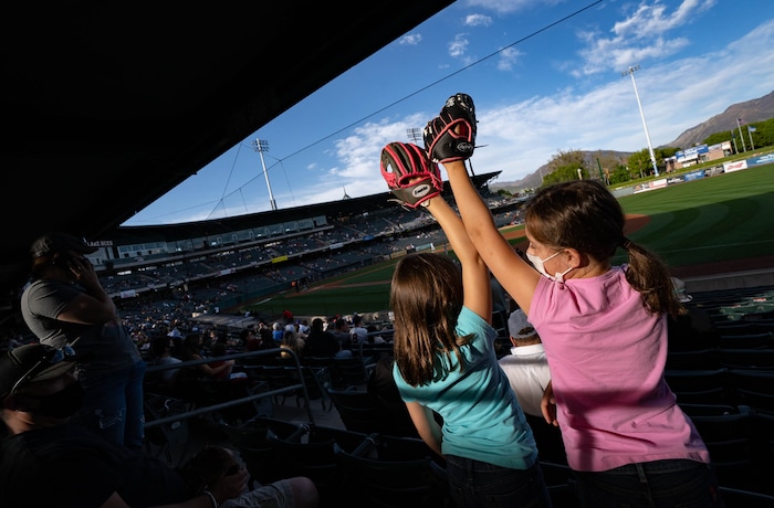 (Francisco Kjolseth | The Salt Lake Tribune) Twin sisters Emmersyn and Connelly Ogden, 8, keep their gloves at the ready as they attend the Salt Lake Bees home opener at Smith’s Ballpark Thursday night, May 6, 2021, after shutting down last season due to the pandemic.