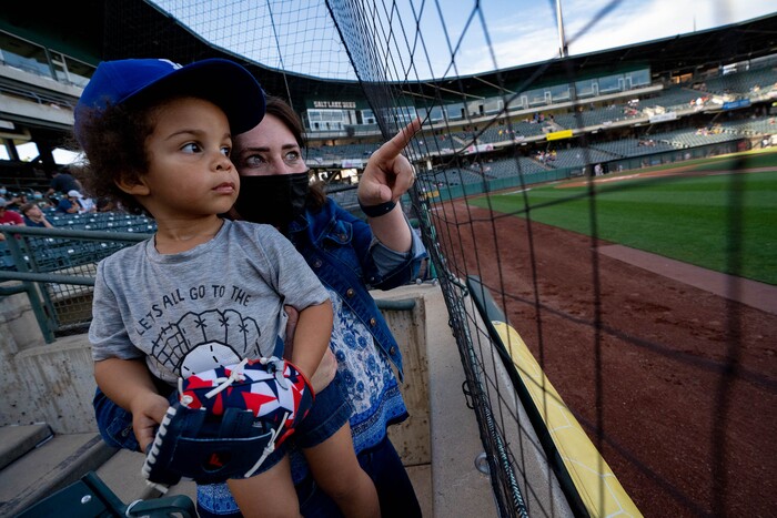 The baseball came easy. With fewer fans in the park, spectators in the stands had unblocked views and those on the outfield berm had plenty of room to spread out in white squares painted on the grass. There were more foul balls to go around, though they had to clear a few extra lengths of new netting, and kids had plenty of space to play catch — a perk fifth-graders Brody Thompson and Jacob Esplin took advantage of in a strip of grass in front of the closed kids zone. They’d come from Spanish Fork with about six family members to watch outfielder Jo Adell, a promising MLB prospect, in action before he gets called up by the Los Angeles Angels.