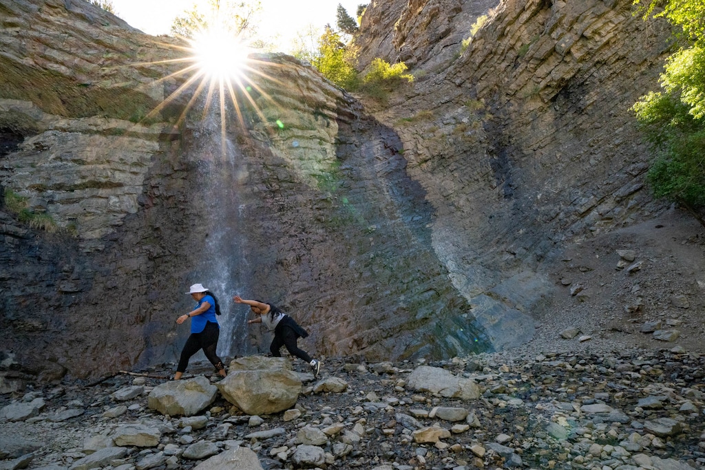 The Hike: From the Battle Creek Falls Trailhead, pass the Kiwanis camp and take the left spur after the trail sign. Then begin the steady-but-manageable incline along a wide path to the bigger waterfall. In .58 miles, a steep spur trail descends to the right, leading right underneath the 50-foot falls. Continue up the main trail over the rubber matting and within .1 mile you’ll find two smaller waterfalls. Venture another .2 miles and you’ll find a makeshift bridge of logs crossing the creek. Right above that is yet another waterfall. From here the trail gets steeper with more of a dropoff. A mile and a quarter into the hike, you’ll hit the junction with the Curly Springs Trail — No. 051. Keep going up, up, up, on the Battle Creek Trail until the trail Ts into the Great Western Trail. Enjoy the small meadow, oodles of wildflowers and views of Utah Lake here before returning the way you came. If you’re still feeling fit after reaching the T, turn left and go another roughly .75 miles to the even larger Fishers Flat meadow. And if you’re feeling absolutely spritely, you can make a loop of this trail by taking the Grove Creek Trail back down the mountain. Return to the Battle Creek Trailhead by cutting through the Kiwanis camp for a total of 8.2 miles.