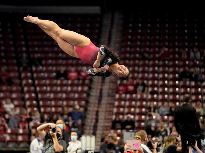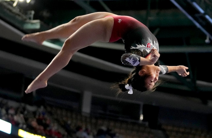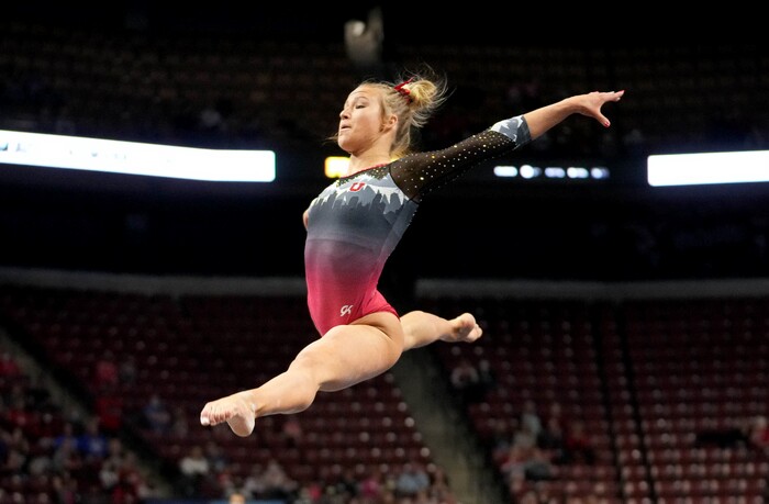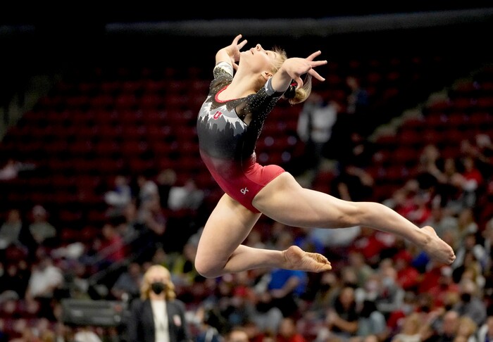 (Francisco Kjolseth | The Salt Lake Tribune) Sydney Soloski performs her floor routine at the Best of Utah NCAA Gymnastics Meet at the Maverik Center in West Valley City on Friday, Jan. 7, 2022.